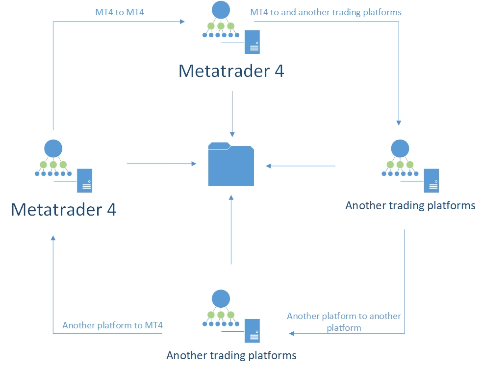 Possible transfer paths: MT4 to MT4, MT4 to another trading platforms, another trading platforms to another trading platforms, another trading platforms to MT4, in file.